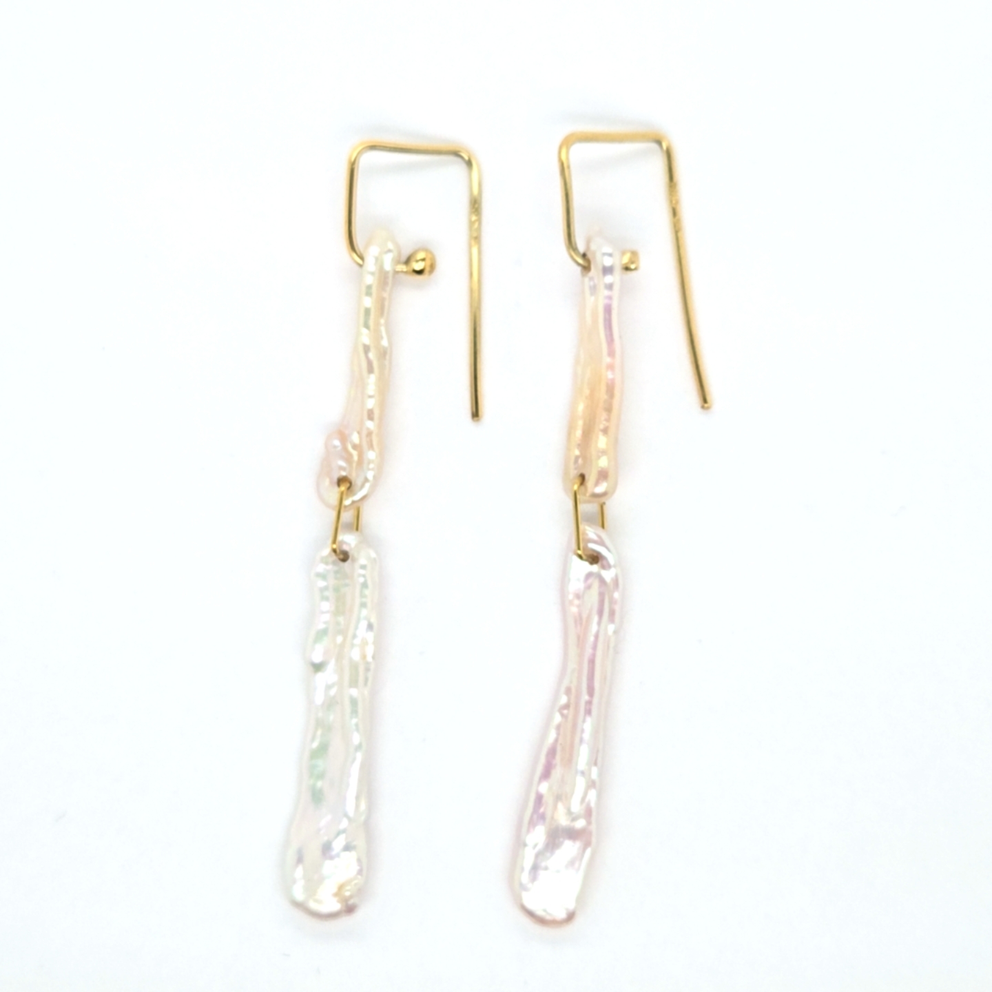 14k yellow gold angular hooks with white/pink baroque pearl studs.