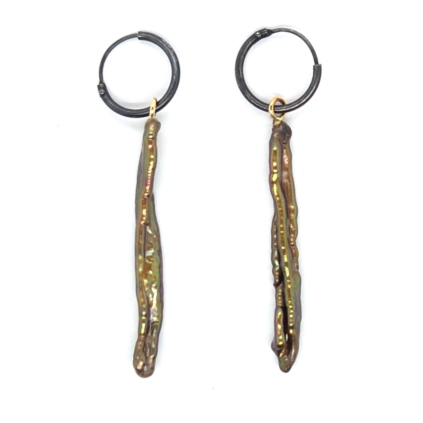 Oxidized silver earrings (11 mm) with green/brown baroque pearl studs and 14k yellow gold loops. The inner loop diameter is 2 mm.