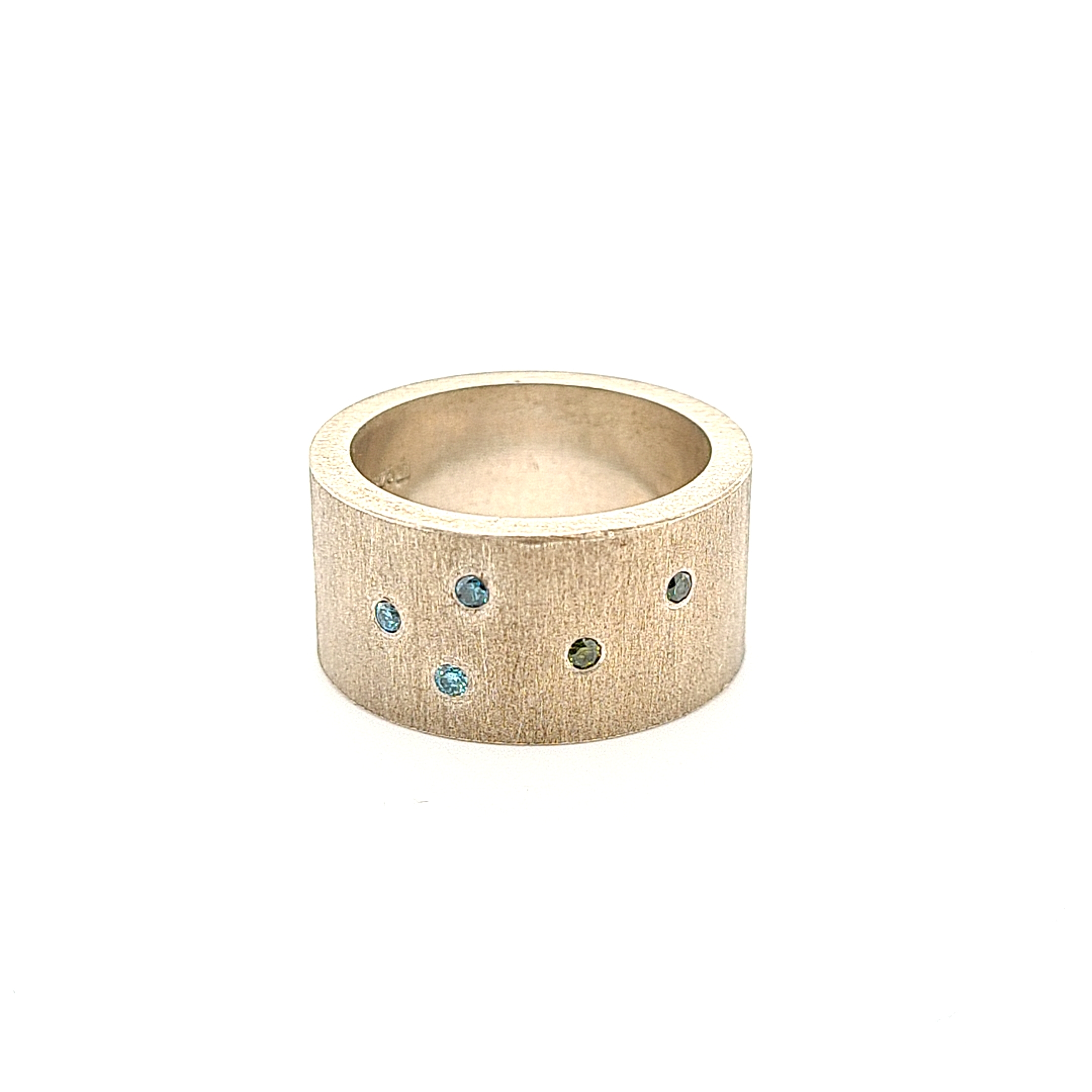 11 mm wide ring, 2 mm high, 5 x 0.02 ct diamonds.