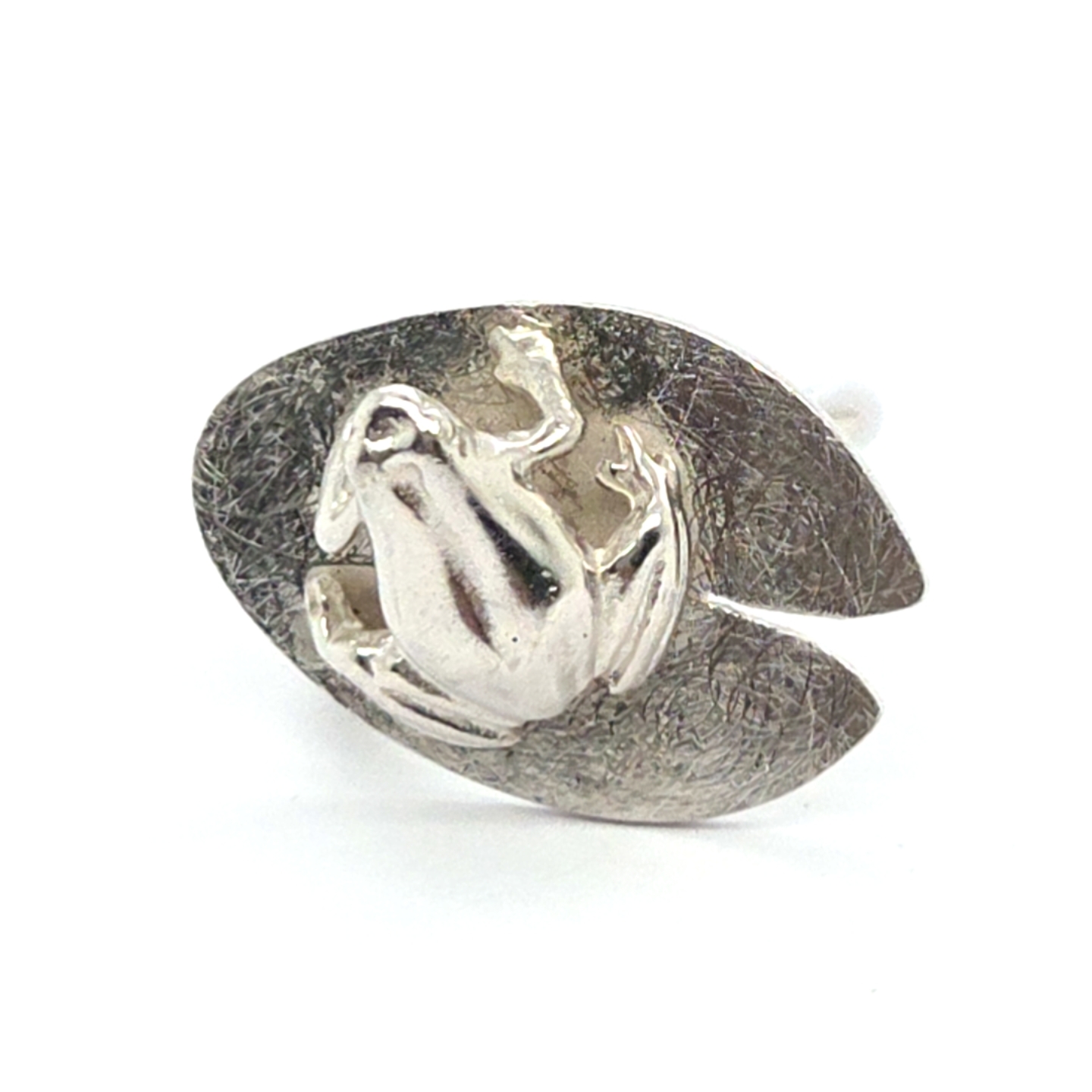Zilveren kikker op zilver lelieblad.